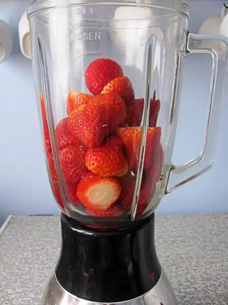 1.将草莓跟蜂蜜倒入搅拌机,打成泥